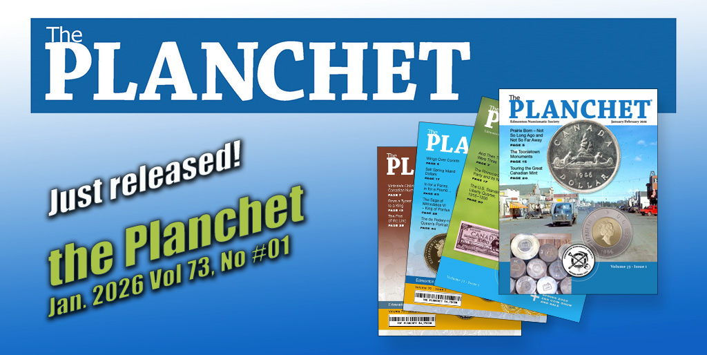 Sign up to become a member of the Edmonton Numismatic Society and receive a free subscription to our award winning numismatic magazine "The Planchet" is published 7 times a year!